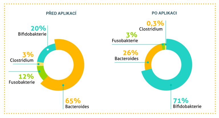 Porovnání střevní mikroflóry před a po užití INUFOS-3 obsažené v přípravku Enerbiotic cat. Po užívání Enerbiotiku bez dodávání probiotik se zvětšil podíl pozitivních bifidobakterií o 51% na celkový počet 71%.